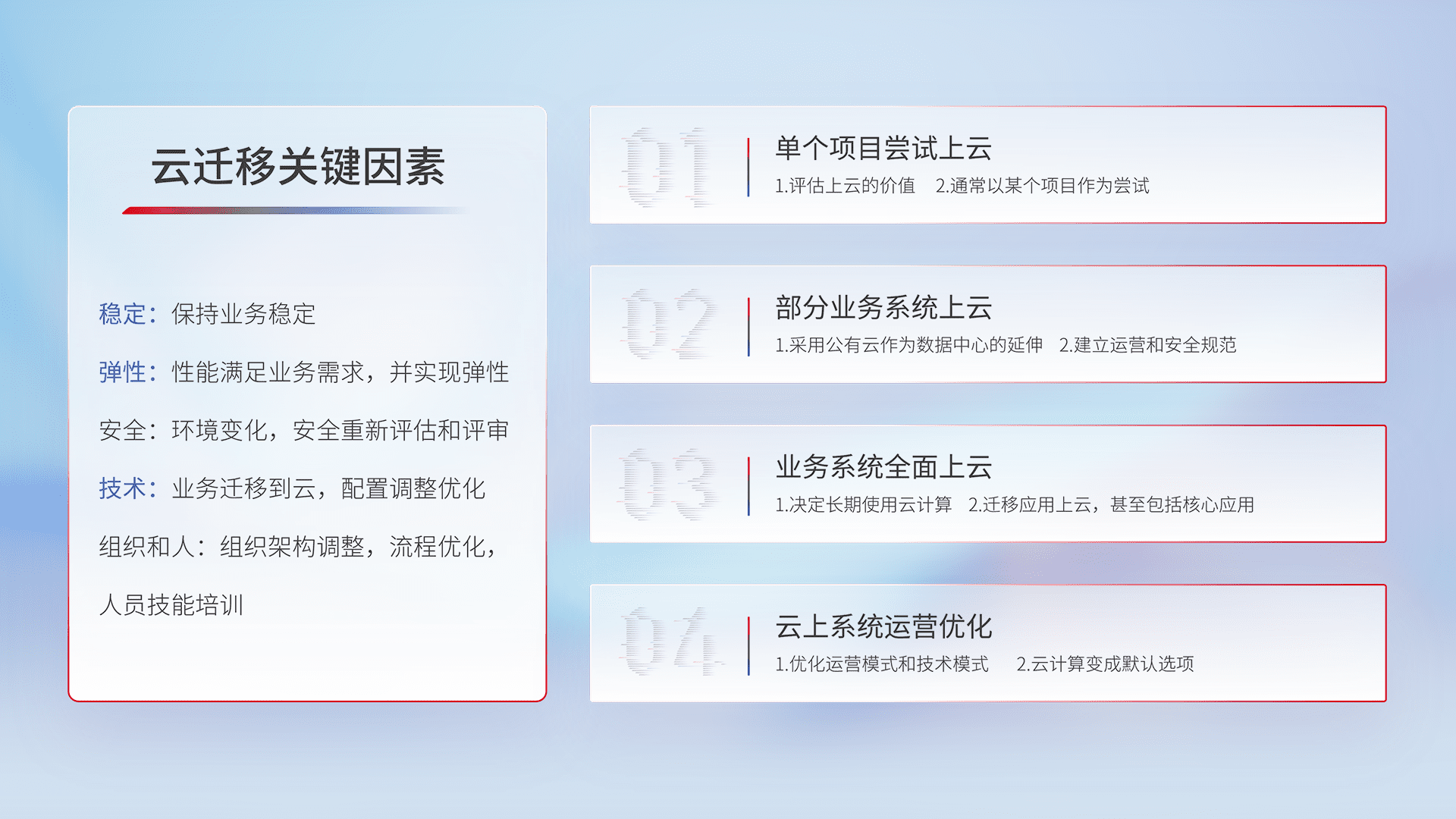结合实际业务,,,从规划设计、、、、云平台选型、、、云原生改造、、、、数据迁移、、集成交付,,,,迁移全过程为客户识别最佳上云路径,,做好风险识别管理,,,设计网络架构、、、身份权限、、、、安全审计合规、、、、操作审计、、、、日志审计、、、监控告警策略、、、多站点容灾设计等,,,对云上基础设施进行整体规划,,,,提升IT治理水平,,以满足弹性、、高可用、、、、高性能的需求。。。
