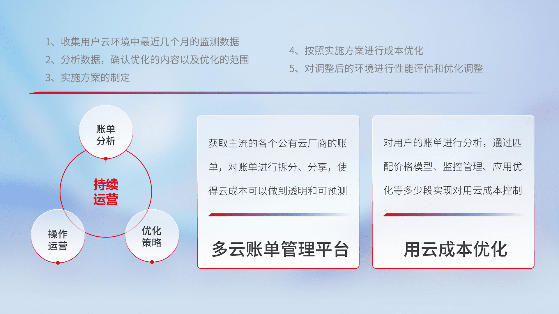 通过多云纳管,,,以统一的资源数据模型把客户的云资源进行抽象和封装,,进而实现对多云资源的统一操作,,保障云资源管理的可靠性、、、稳定性与可用性。。。量身定制化运维内容,,,,配置、、、、开发运维、、、补丁管理、、备份、、、、监控、、认证和访问管理、、、、审计和日常巡检等,,,保障在用云过程中的可靠度,,稳定度以及高可用率。。。