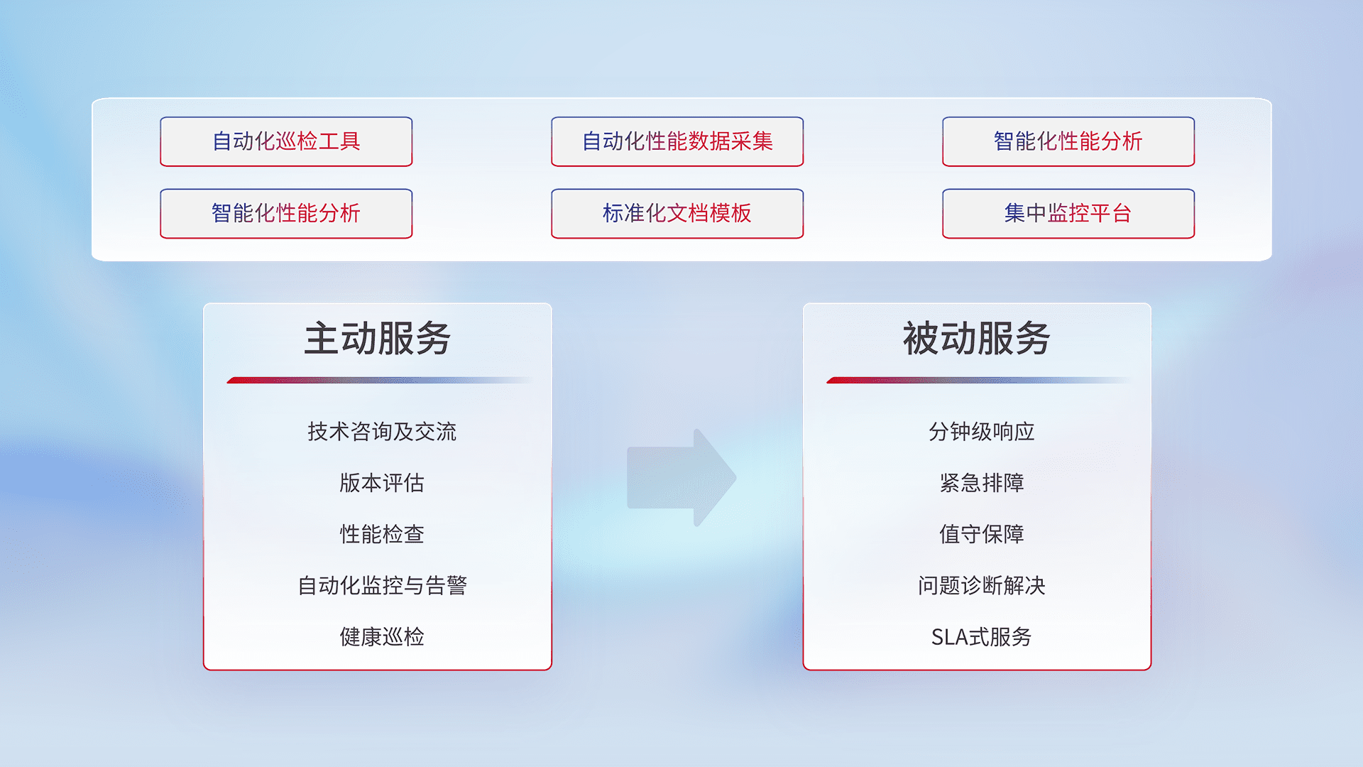 智能化工具和标准化文档,,保障服务质量,,提供主动服务(包含技术咨询、、、版本评估、、、、性能检查、、自动化监控与告警、、、、健康巡检)和被动服务包含(分钟级响应、、、、紧急排障、、、、值守保障、、、、问题诊断解决、、、SLA服务)。。。。